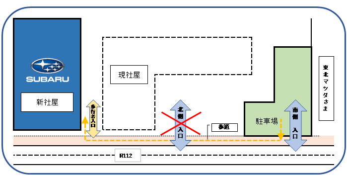 一旦、歩道に出て新社屋まで通行していただくことになります。