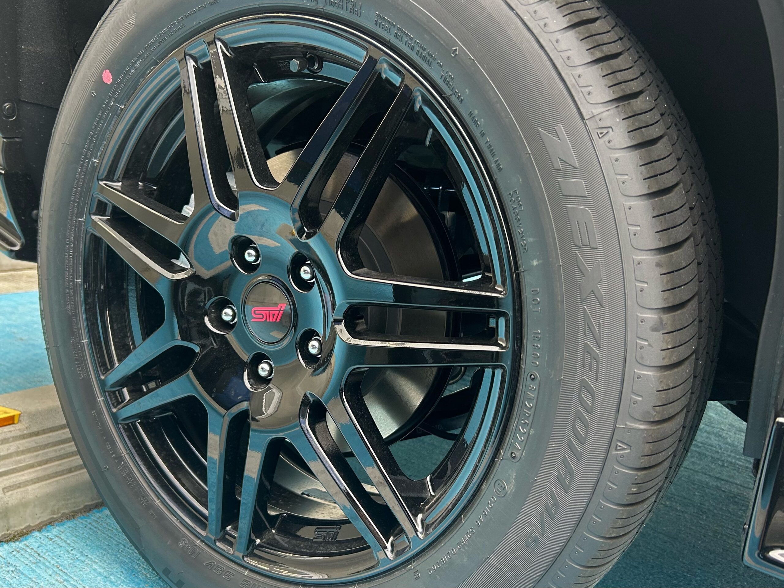 チェリーレッドのSTIマークが映えるSTIアルミホイール![]()